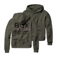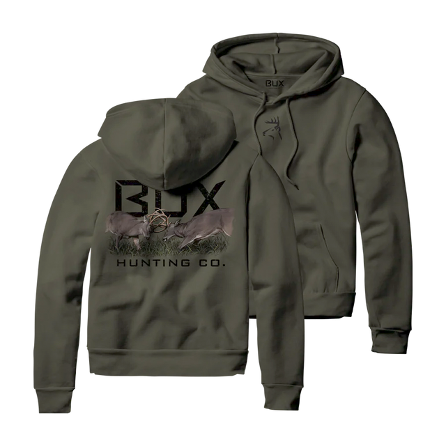 The Bux Full Rut Midweight Hoodie Features a buck fight design on a classic solid green hoodie.