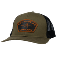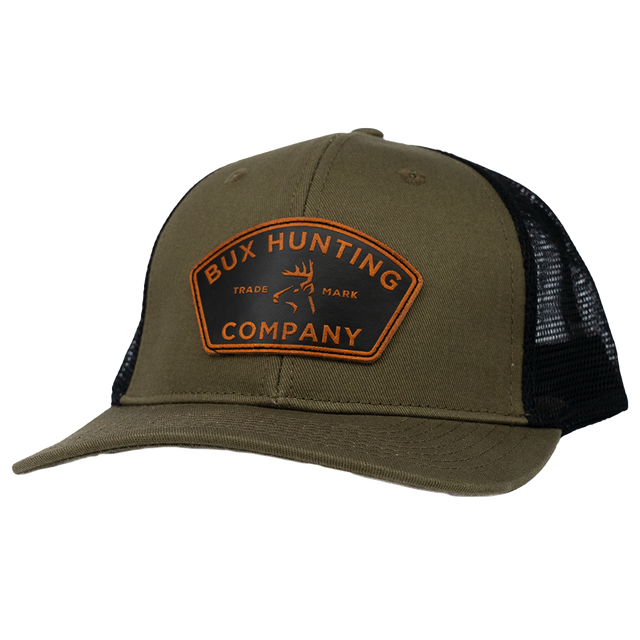 The BUX leather patch hat is a classic trucker style hat in a dark OD green front it pairs perfectly with your Bux Camo in the field or a pair of jeans for a night on the town.