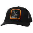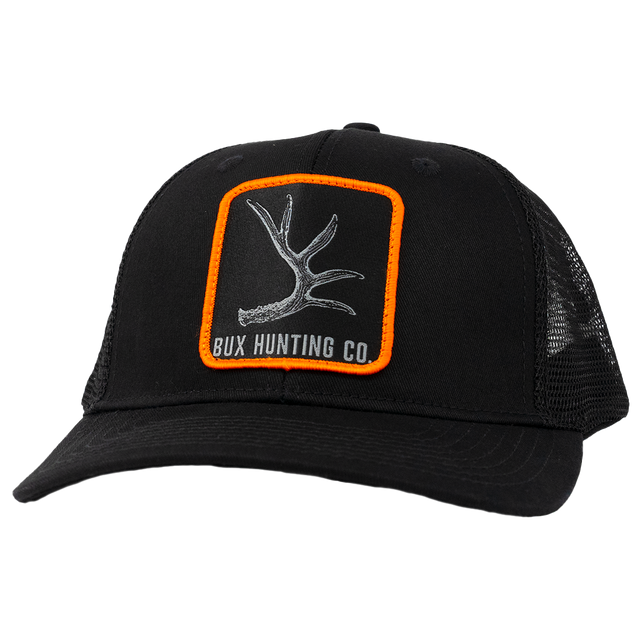 The New BUX shed hat is a slick all black patch hat with hints of orange and a classic shed antler outline, a must have for all deer hunters.