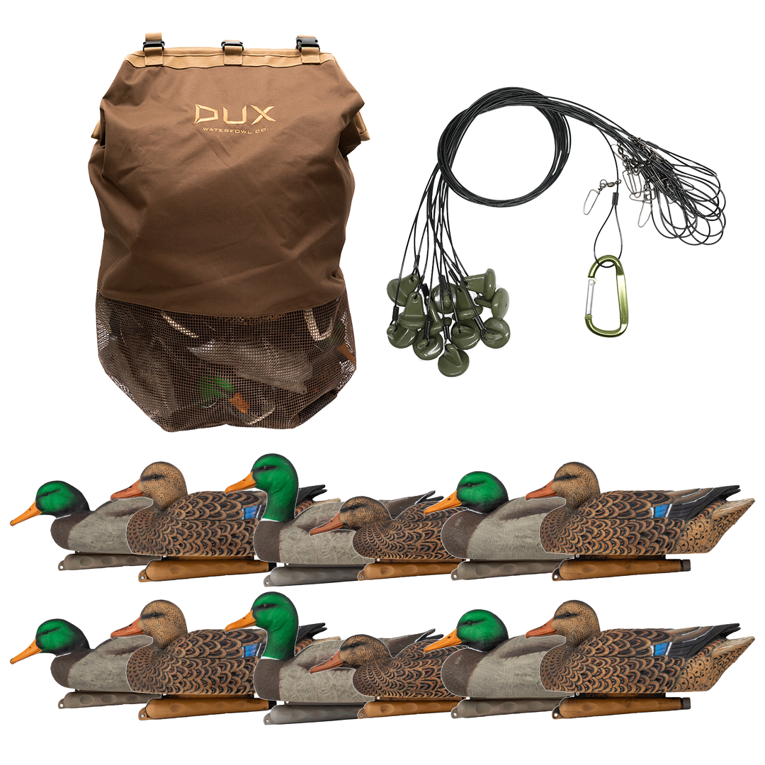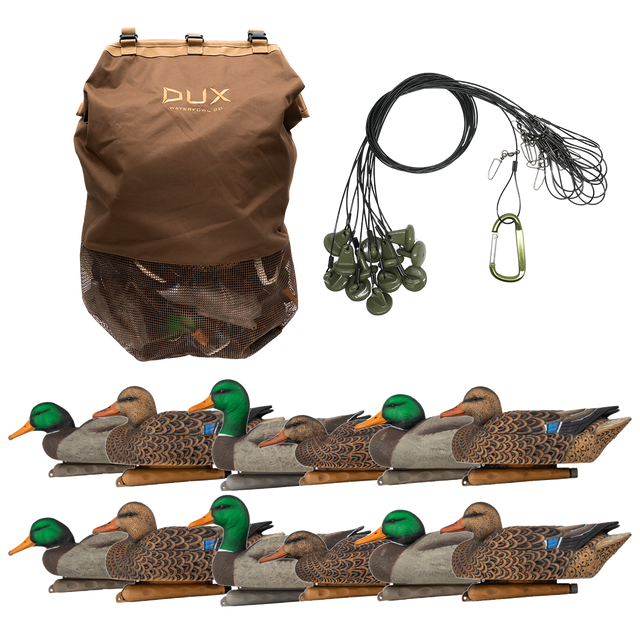 The Dux NXT GEN Decoy Bundle is a one stop shop to get all your decoy essentials for the season! Includes: (1) Run-N-Gun Decoy Bag, (1) Dux NXT GEN Texas Rigs (1 dozen), (2) Dux NXT GEN Mallard Floater 6 packs (12 decoys total).