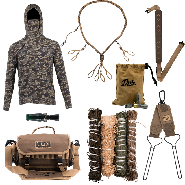 The DUX Teal Szn Loaded Bundle is packed with everything you need for your teal hunts this season! Includes: (1) Backwoods camo performance hoodie, (1) Dux Money Lanyard, (1) Dux Shotgun Sling, (1) Waxed canvas Shell Bag, (1) Dux Game Tote, (1) NXT GEN Duck Call, (1) Dux Ghost Grass, (1) Run-N-Gun Blind bag.