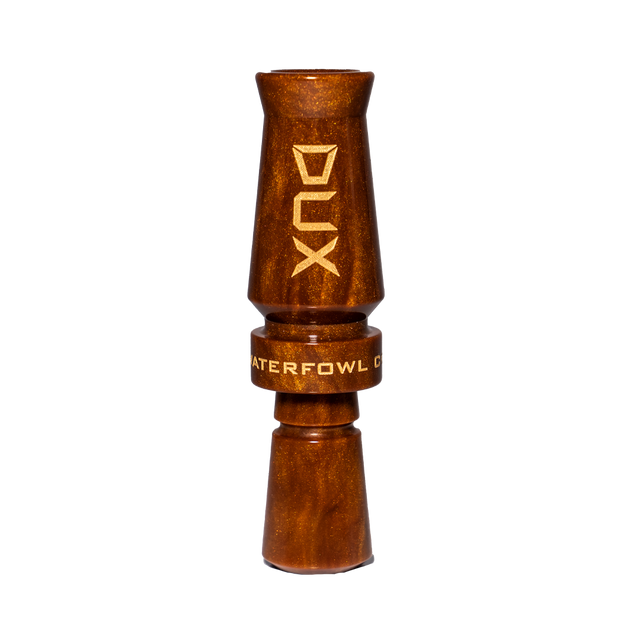 The Dux Two Tone Duck call is the ultimate Double Reed Duck call, Featuring a caramel pearl color way and a super easy to blow double reed construction, this call will become your new go to!