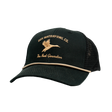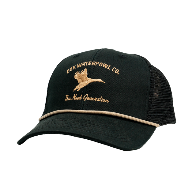 The Dux Mallard Rope Hat is the perfect all around dux hat no matter the situation! Featuring a gold embroidered mallard logo, and a matching gold rope, on a classic black trucker hat!