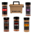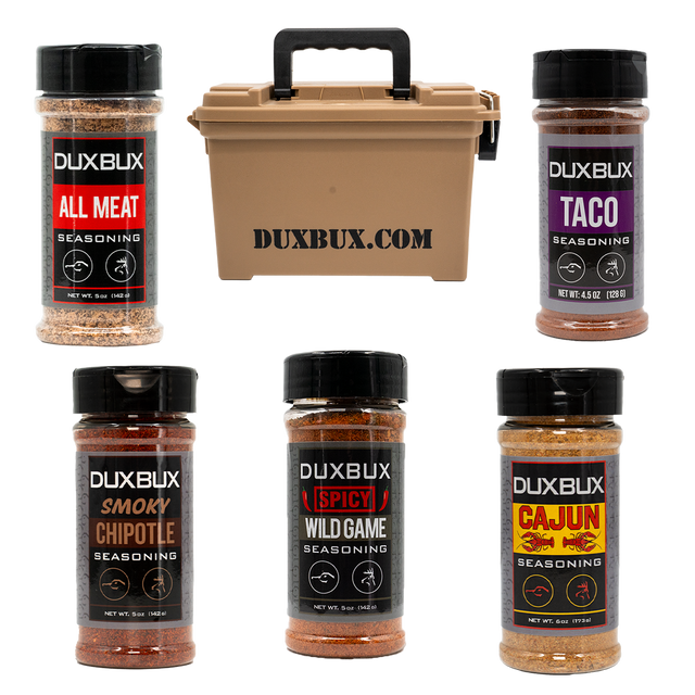 This Bundle includes (1) all meat, taco, smoky chipotle, spicy wild game, and cajun seasoning all inside a small dux ammo crate!