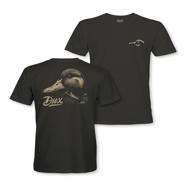 The Dux Mallard Drake T-shirt Features a high detail mallard drake design on a classic black t-shirt!