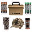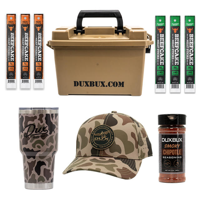 This Bundle Includes (1) Ammo Crate, (1) Dux Camo Tumbler, (1) Dux Camo Performance hat, (1) Smoky Chipotle Seasoning, (3) Original Meat Sticks, (3) Jalapeno Honey Meat Sticks.