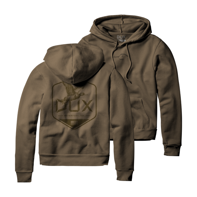 The DUX Mallard Badge Thermal Hoodie is the perfect hoodie for your next hunt, Featuring a tan color way, a tonal mallard design, and in our dux thermal weight hoodie. This hoodie will keep you warm and concealed all season long!
