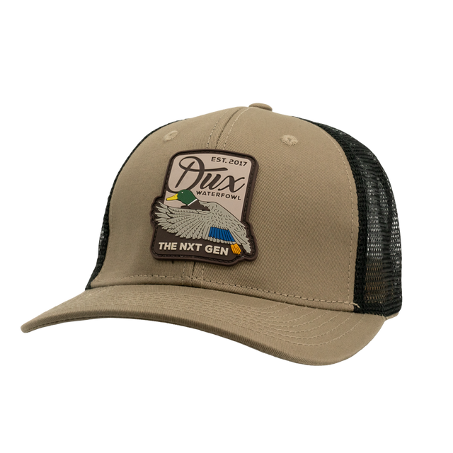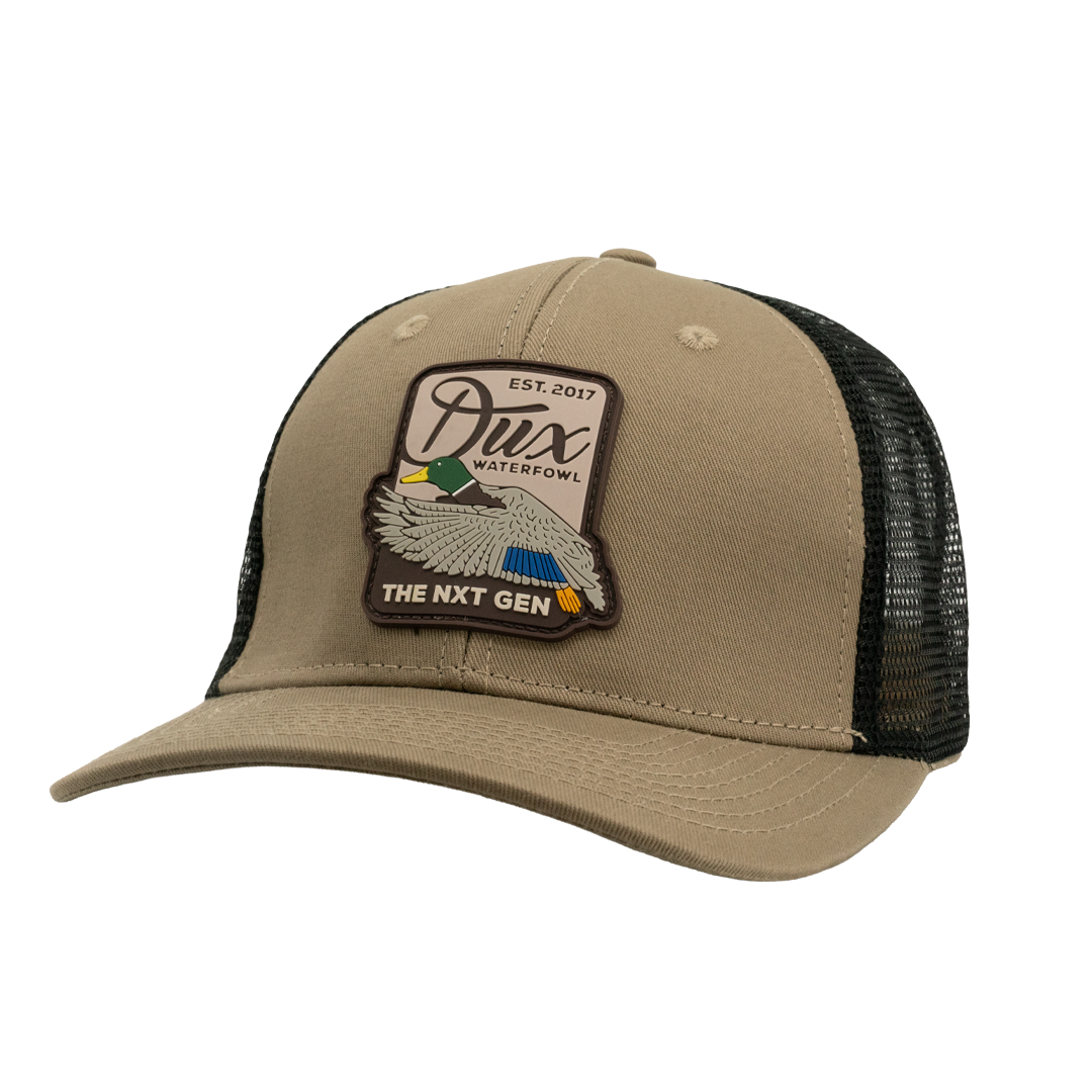 The DUX Head Patch hat is a classic 6 panel trucker hat, featuring a tan front and rubber DUX Greenhead patch this will become a Go-to in your hat line up!