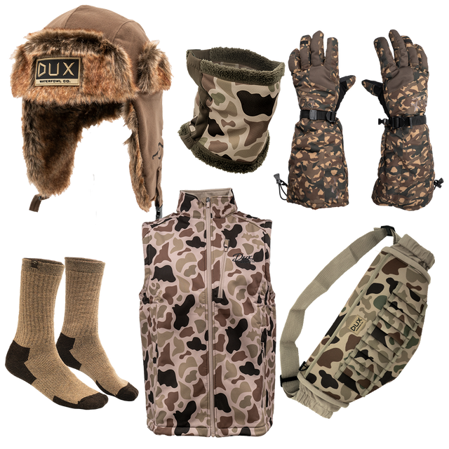 The DUX Cold Gear Bundle comes loaded with everything you need to stay warm this season! (1) Trapper Hat, (1) Thermal neck gaiter, (1) Dux Wader Gloves, (1) Dux Merino Wool Socks, (1) DUX Camo Vest, (1) Thermal Hand Muff!