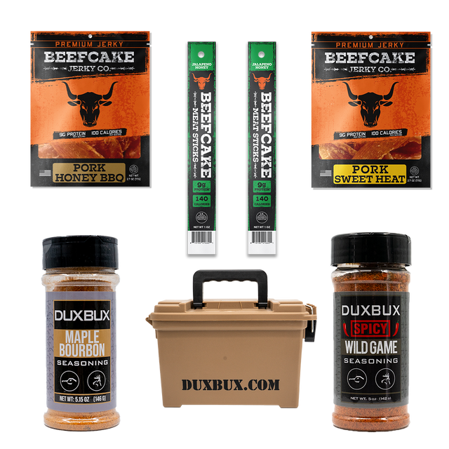 The Sweet & Spicy Crate Comes with all your snacking essentials! (1) Honey BBQ Jerky, (1) Sweet Heat Jerky, (2) Jalapeno Honey Meat Sticks, (1) Maple Bourbon Seasoning, (1) Spicy Wildgame Seasoning, (1) DUX Ammo Crate!
