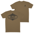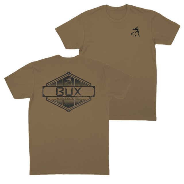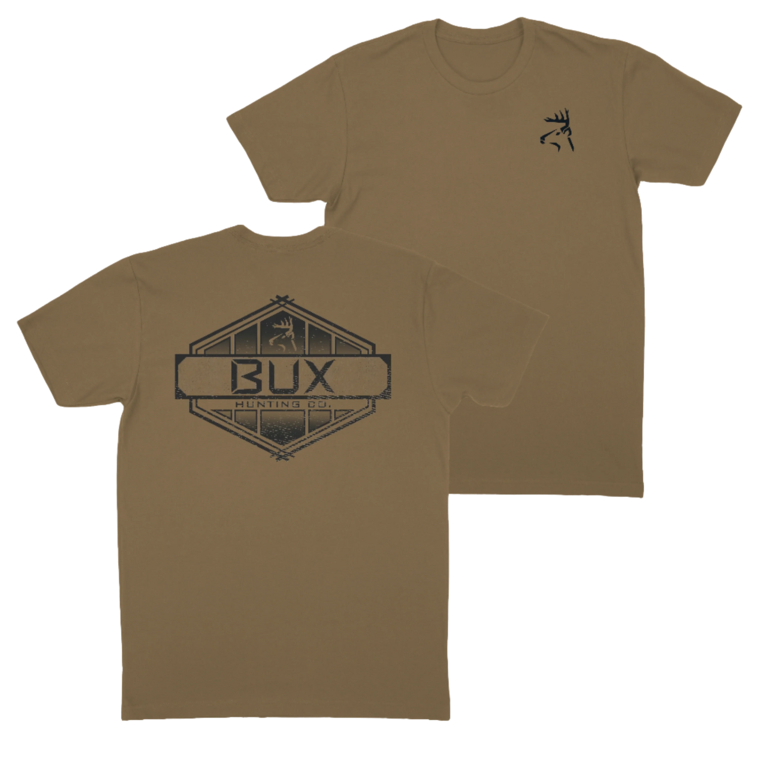 The New BUX Badge T-Shirt features a sleek Bux logo badge design on a classic brown shirt, perfect for hanging stands, setting trail cams or wearing around deer camp!